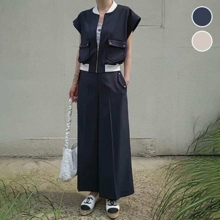 ジレ風 半袖 ジップアップ セットアップ センタープレスパンツ [AMELY by La-gemme]ジレ風 半袖 ジップアップ セットアップ センタープレスパンツ きれいめ カジュアル ワイドパンツ 夏 おすすめ レディース オシャレ トレンド 人気 プチプラ 韓国ファッション 【00317-day】【予約販売:15-20日】【送料無料】メ込2
