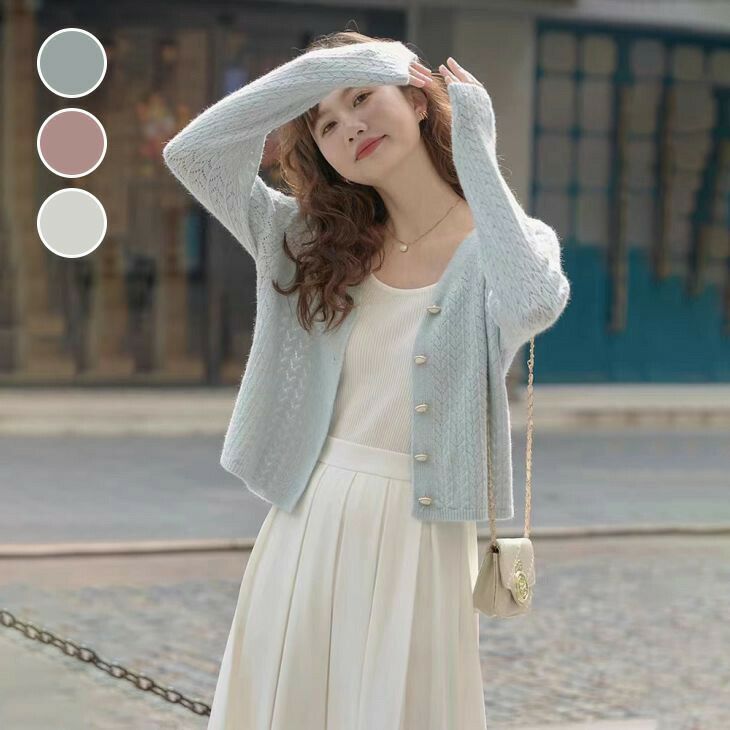 Vネック ニット カーディガン 長袖 トップス [AMELY by La-gemme]Vネック ニット カーディガン 長袖 トップス 羽織り フェミニン レイヤード かわいい ショート丈 おすすめ レディース オシャレ トレンド 人気 プチプラ 韓国ファッション 【07141-xjm】【予約販売:15-20日】【送料無料】メ込2