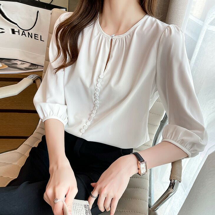 ギャザー ブラウス レディース 7分袖 パフスリーブ ギャザー ブラウス レディース 7分袖 パフスリーブ 上品きれいめ Uネック Vネック 大人 仕事 オフィス 通勤 オケージョン トップス シャツ とろみブラウス おしゃれ 可愛い 2025秋新作 【1209-bh436】【予約販売:15-20日】【送料無料】メ込2