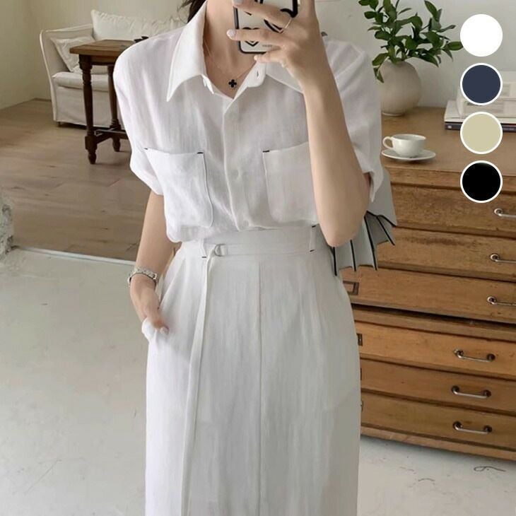 リネン風 パフスリーブ シャツ ベルト風 タイトスカート [AMELY by La-gemme]リネン風 パフスリーブ シャツ ベルト風 タイトスカート セットアップ 2点セット トップス 半袖 夏 おすすめ レディース オシャレ トレンド 人気 プチプラ 韓国ファッション 【1622-fx11】【予約販売:15-20日】【送料無料】メ込2