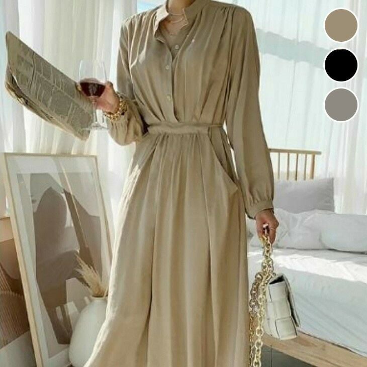 キーネック ロングワンピース ノーカラー マキシ [AMELY by La-gemme]キーネック ロングワンピース ノーカラー マキシ ウエストギャザー 長袖 無地 シンプル きれいめ 春夏 おすすめ レディース オシャレ トレンド 人気 プチプラ 韓国ファッション【181-ne】【予約販売:15-20日】【送料無料】メ込2