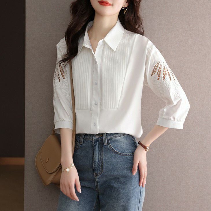 レース袖 ブラウス シャツ シアー 刺繍 [AMELY by La-gemme]レース袖 ブラウス シャツ シアー 刺繍 透け感 上品 キレイめ デート オフィスカジュアル おすすめ おしゃれ レディース トレンド 人気 プチプラ 韓国ファッション 2025春新作 【1830-v】【予約販売:15-20日】【送料無料】メ込2