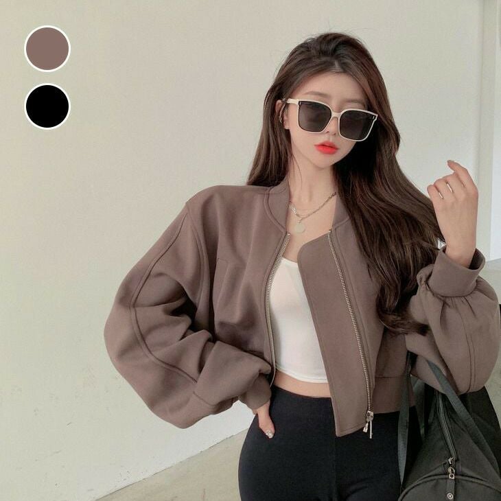 ノーカラー パフスリーブ ショート ジャケット ジップアップ [AMELY by La-gemme]ノーカラー パフスリーブ ショート ジャケット ジップアップ シンプル 無地 カジュアル きれいめ 春夏 おすすめ レディース オシャレ トレンド 人気 プチプラ 韓国ファッション【24aw-it138】【予約販売:15-20日】【送料無料】宅込