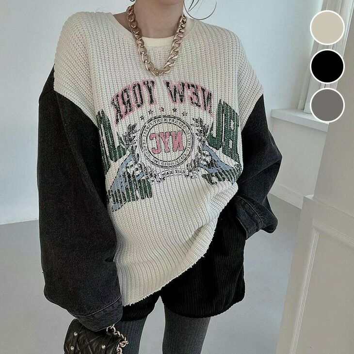 プリント 異素材 トップス ニット デニム袖 [AMELY by La-gemme]プリント 異素材 トップス ニット デニム袖 オーバーサイズ ゆったり カジュアル ストリート 春夏 おすすめ レディース オシャレ トレンド 人気 プチプラ 韓国ファッション【24aw-it194】【即納:1-5営業日】【送料無料】宅込