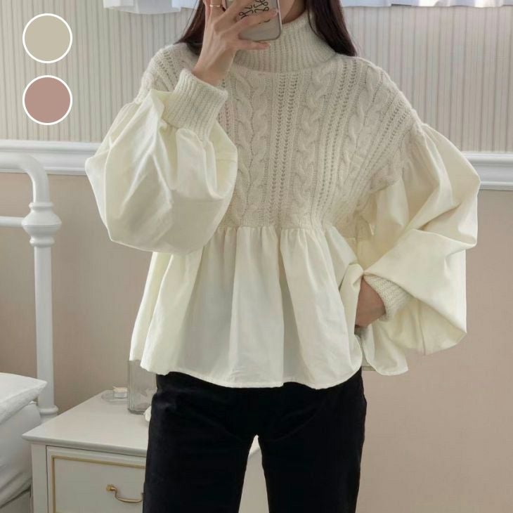 トップス 異素 材ドッキング ニット トップス [AMELY by La-gemme]トップス 異素 材ドッキング ニット トップス ケーブル フレア ミックス ボリューム袖 プルオーバー 春夏 おすすめ レディース オシャレ トレンド 人気 プチプラ 韓国ファッション【24aw-it220】【予約販売:15-20日】【送料無料】宅込