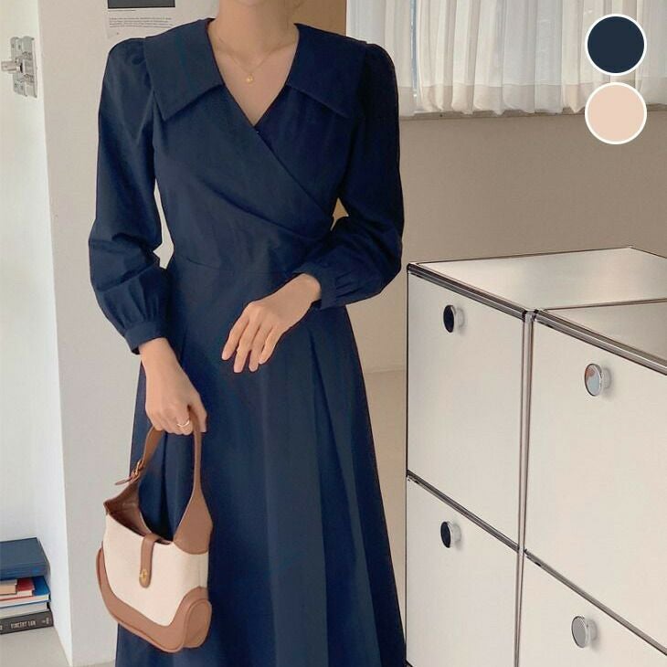 ビッグカラー カシュクール ワンピ パフスリーブ ロング [AMELY by La-gemme]ビッグカラー カシュクール ワンピ パフスリーブ ロング マキシ シンプル 無地 きれいめ 長袖 春夏 おすすめ レディース オシャレ トレンド 人気 プチプラ 韓国ファッション【24aw-it249】【予約販売:15-20日】【送料無料】メ込2