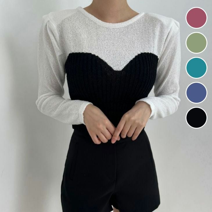 ビスチェ風 シアーニット 肩パットあり ショート丈 シンプル [AMELY by La-gemme]ビスチェ風 シアーニット 肩パットあり ショート丈 シンプル 長袖 異素材 トップス 80年代風 春夏 おすすめ レディース オシャレ トレンド 人気 プチプラ 韓国ファッション【24aw-it258】【予約販売:15-20日】【送料無料】メ込2