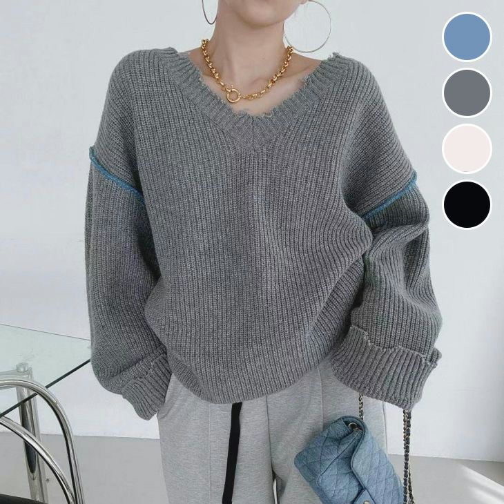 Vネック ステッチ ニット ダメージ風 シンプル [AMELY by La-gemme]Vネック ステッチ ニット ダメージ風 シンプル オーバーサイズ ドロップショルダー 長袖 バックタグ 春夏 おすすめ レディース オシャレ トレンド 人気 プチプラ 韓国ファッション【24aw-it259】【即納:1-5営業日】【送料無料】宅込