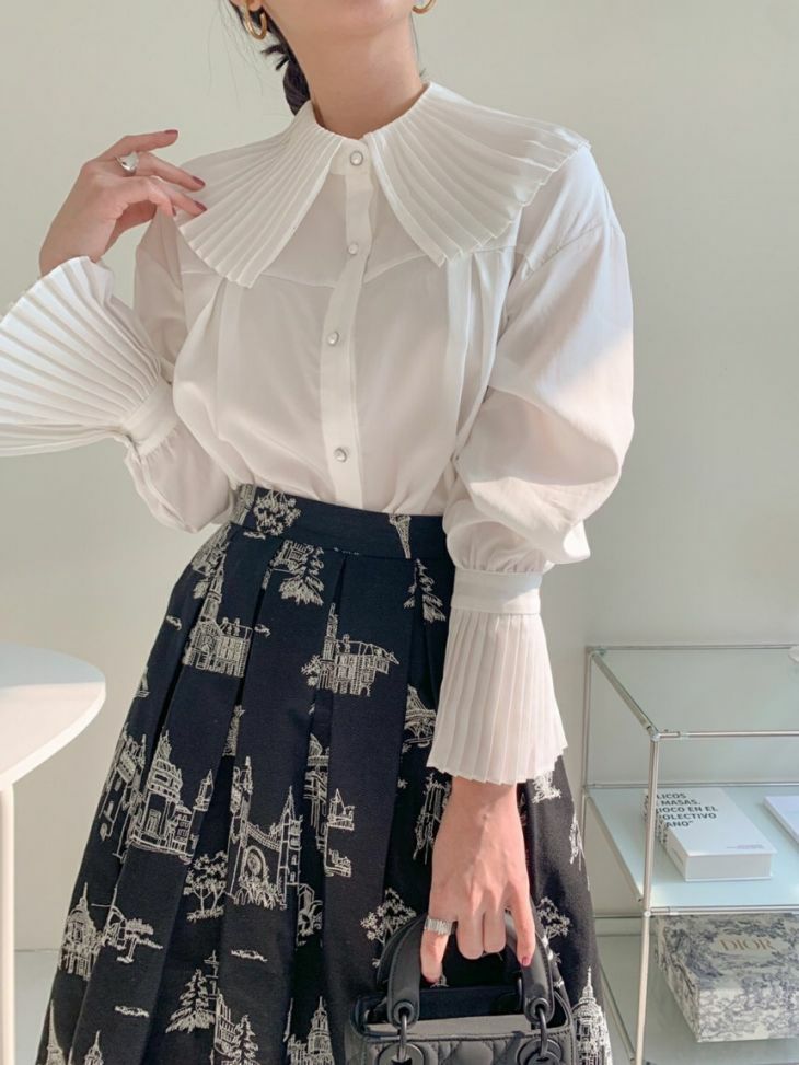 ビッグ プリーツカラー シャツ 袖プリーツ プリーツ [AMELY by La-gemme]ビッグ プリーツカラー シャツ 袖プリーツ プリーツ 個性的 デザインシャツ ガーリー 長袖 シンプル 春夏 おすすめ レディース オシャレ トレンド 人気 プチプラ 韓国ファッション【24aw-it260】【予約販売:15-20日】【送料無料】メ込2