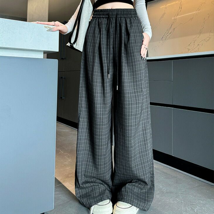 ワイドパンツ タック入り チェック柄 ウエストゴム ウエスト紐 [AMELY by La-gemme]ワイドパンツ タック入り チェック柄 ウエストゴム ウエスト紐 ゆったり 体型カバー 春夏 おすすめ レディース オシャレ トレンド 人気 プチプラ 韓国ファッション【24aw-it67】【予約販売:15-20日】【送料無料】メ込3