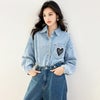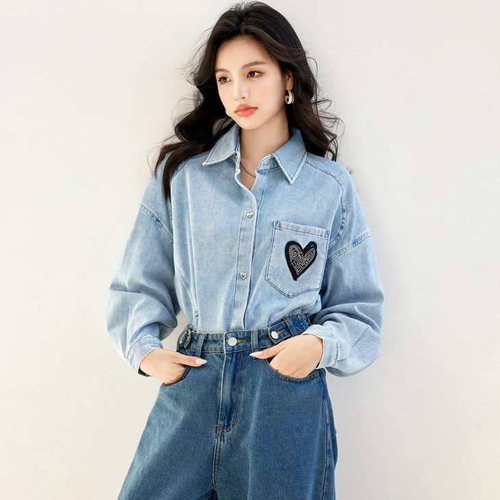 ノーカラー ジャケット ボリューム袖 カジュアル [AMELY by La-gemme]デニム シャツ ハートモチーフ オーバーサイズ カジュアル 長袖 羽織り トップス ライトアウター おすすめ レディース オシャレ トレンド 人気 プチプラ 韓国ファッション【3135-gt】【予約販売:15-20日】【送料無料】メ込3