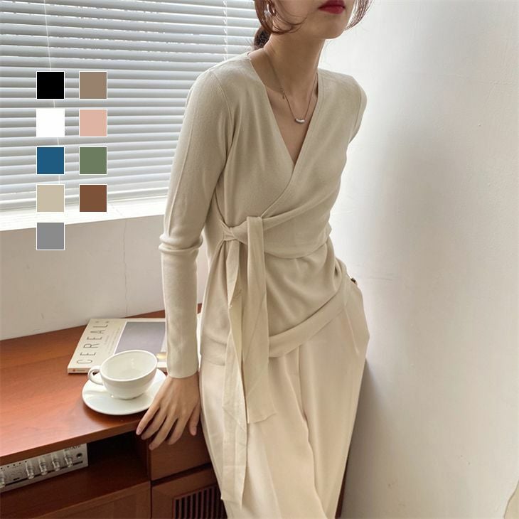 カシュクール風 ラップ ニット トップス 長袖 [AMELY by La-gemme]カシュクール風 ラップ ニット トップス 長袖 Vネック リボン シンプル 重ね着 インナー レイヤード 伸縮 細見え 多色展開 お洒落 トレンド きれいめ オフィス カジュアル ガーリー 大人 レディース 春夏 韓国ファッション【3312-lj】【即納:1-5営業日】【送料無料】メ込1