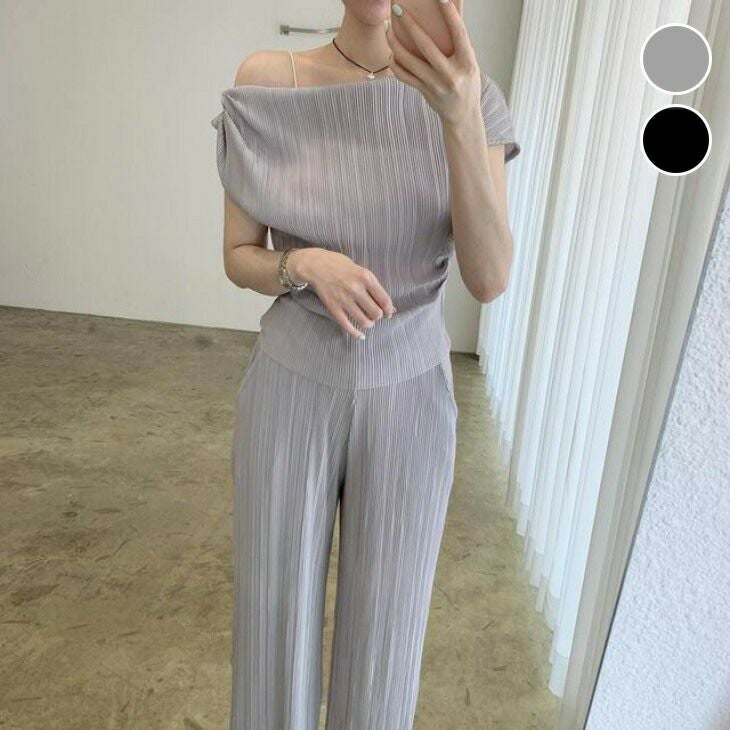 アシンメトリー オフショルトップス プリーツパンツ [AMELY by La-gemme]アシンメトリー オフショルトップス プリーツパンツ セットアップ セット 無地 シンプル きれいめ 夏 おすすめ レディース オシャレ トレンド 人気 プチプラ 韓国ファッション 【3432-fx3】【予約販売:15-20日】【送料無料】メ込2