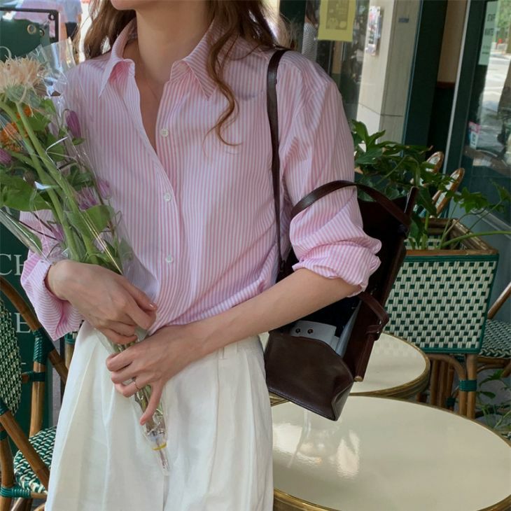 ストライプ シャツ ブラウス 長袖 トップス [AMELY by La-gemme]ストライプ シャツ ブラウス 長袖 トップス カジュアル かわいい オフィス 通勤 レイヤード デイリー おすすめ レディース オシャレ トレンド 人気 プチプラ 韓国ファッション【358-xf】【予約販売:15-20日】【送料無料】メ込2