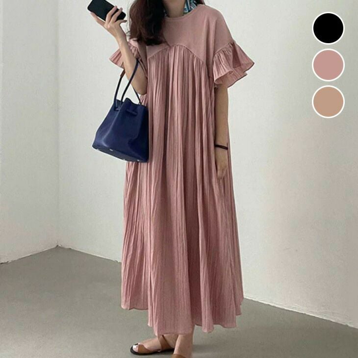 フリルスリーブ プリーツ ワンピース ロングワンピ アシメ [AMELY by La-gemme]フリルスリーブ プリーツ ワンピース ロングワンピ アシメ 半袖 無地 シンプル きれいめ ガーリー 夏 おすすめ レディース オシャレ トレンド 人気 プチプラ 韓国ファッション 【3918-n515】【予約販売:15-20日】【送料無料】メ込2