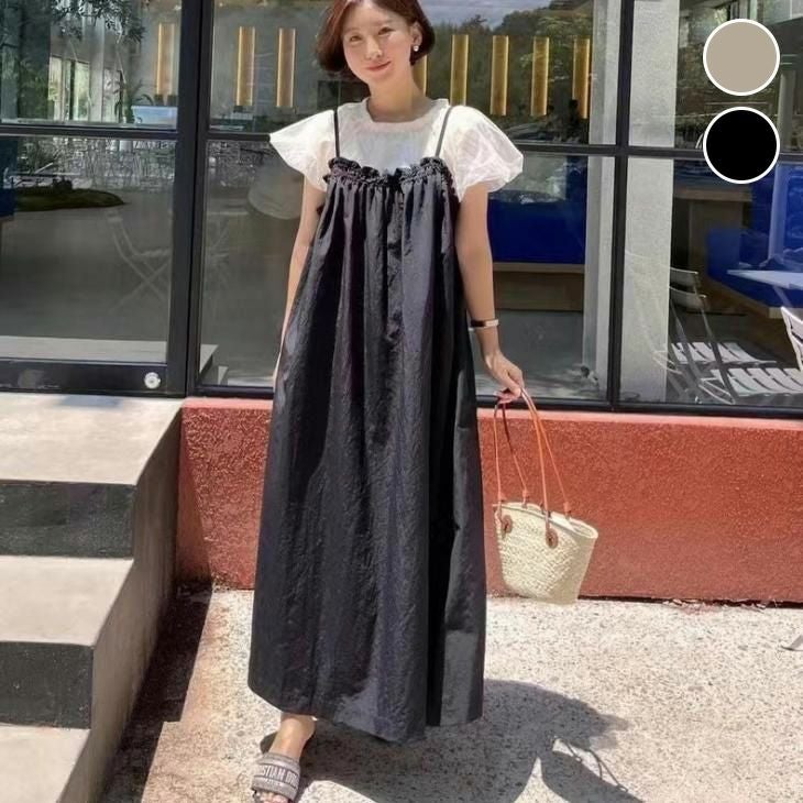 ギャザー キャミ ワンピース フリル ロング [AMELY by La-gemme]ギャザー キャミ ワンピース フリル ロング ゆったり シンプル 無地 カジュアル ガーリー 楽ちん 夏 おすすめ レディース オシャレ トレンド 人気 プチプラ 韓国ファッション 【4840-gr707】【予約販売:15-20日】【送料無料】メ込2