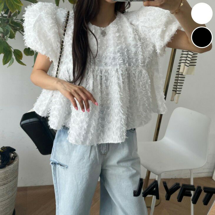 パフスリーブ フリンジ ペプラム トップス 半袖 [AMELY by La-gemme]パフスリーブ フリンジ ペプラム トップス 半袖 シアー チュニック ガーリー きれいめ おすすめ ボリューム袖 レディース オシャレ トレンド 人気 プチプラ 韓国ファッション 【4935-fx】【予約販売:15-20日】【送料無料】メ込2