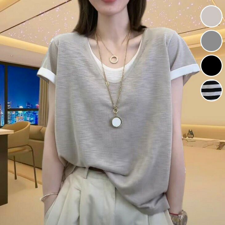 レイヤード風 Tシャツ カットソー シンプル カジュアル [AMELY by La-gemme]レイヤード風 Tシャツ カットソー シンプル カジュアル きれいめ 半袖 無地 ゆったり 夏 おすすめ ボリューム袖 レディース オシャレ トレンド 人気 プチプラ 韓国ファッション 【72341-gtbf】【予約販売:15-20日】【送料無料】メ込2