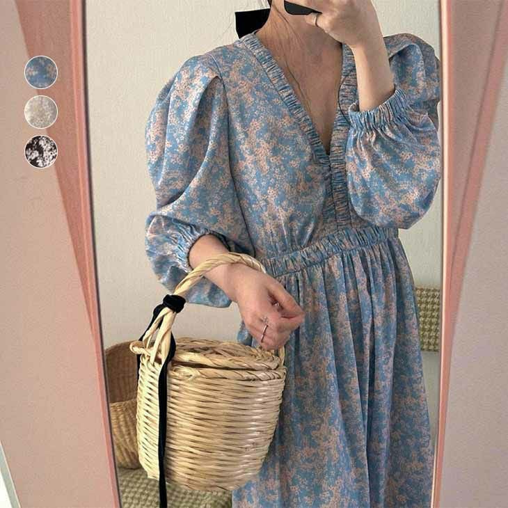 ワンピース 花柄 ロング丈 フェミニン パフスリーブ [AMELY by La-gemme]ワンピース 花柄 ロング丈 フェミニン パフスリーブ Vネック 七分袖 ピクニック お出かけ ガーリー 可愛い おすすめ レディース オシャレ トレンド 人気 プチプラ 韓国ファッション 【7663-fx】【予約販売:15-20日】【送料無料】メ込3