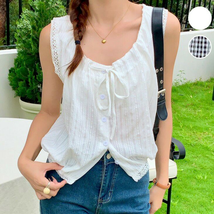 ブラウス トップス フロントリボン Uノースリーブスリーブ [AMELY by La-gemme]ブラウス トップス フロントリボン Uネック ノースリーブスリーブ レース ガーリー 薄手 おすすめ レディース オシャレ トレンド 人気 プチプラ 韓国ファッション 【8252-fx8】【予約販売:15-20日】【送料無料】メ込2