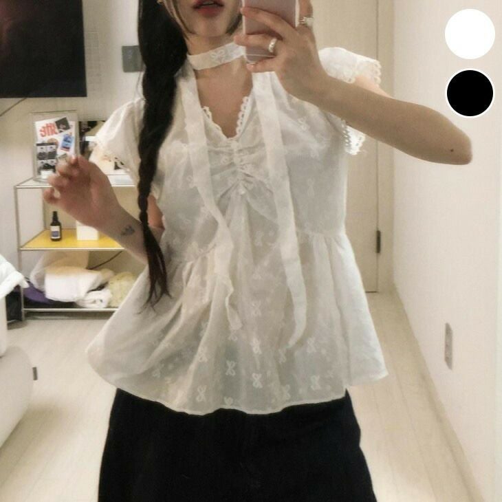 ブラウス チョーカーモチーフ トップス リボン柄 シースルー [AMELY by La-gemme]ブラウス チョーカーモチーフ トップス リボン柄 シースルー 深Vネック スカラップレース おすすめ レディース オシャレ トレンド 人気 プチプラ 韓国ファッション【8525-fx2】【予約販売:15-20日】【送料無料】メ込2