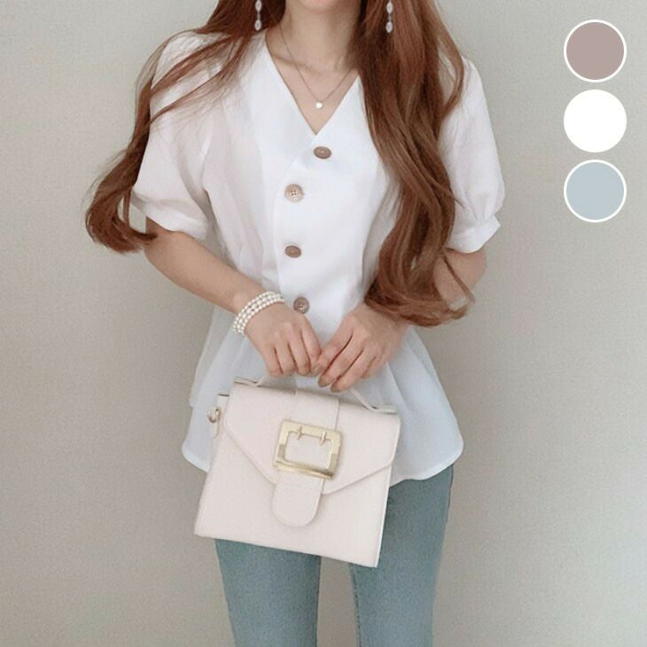 シャツ ブラウス カーブデザイン Ⅴネック ぽわん袖 [AMELY by La-gemme]シャツ ブラウス カーブデザイン Ⅴネック ぽわん袖 キレイめ 大人かわいい シンプル デート おすすめ おしゃれ レディース トレンド 人気 プチプラ 韓国ファッション 2025春夏新作 【8940-fx】【予約販売:15-20日】【送料無料】メ込2