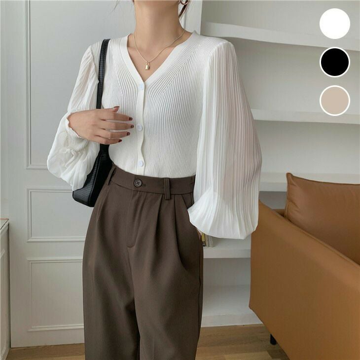 シアー スリーブ ニット ドッキング トップス [AMELY by La-gemme]シアー スリーブ ニット ドッキング トップス 長袖 Vネック カーデ シンプル 無地 オフィス きれいめ 春夏 おすすめ レディース オシャレ トレンド 人気 プチプラ 韓国ファッション【9056-d】【予約販売:15-20日】【送料無料】メ込2