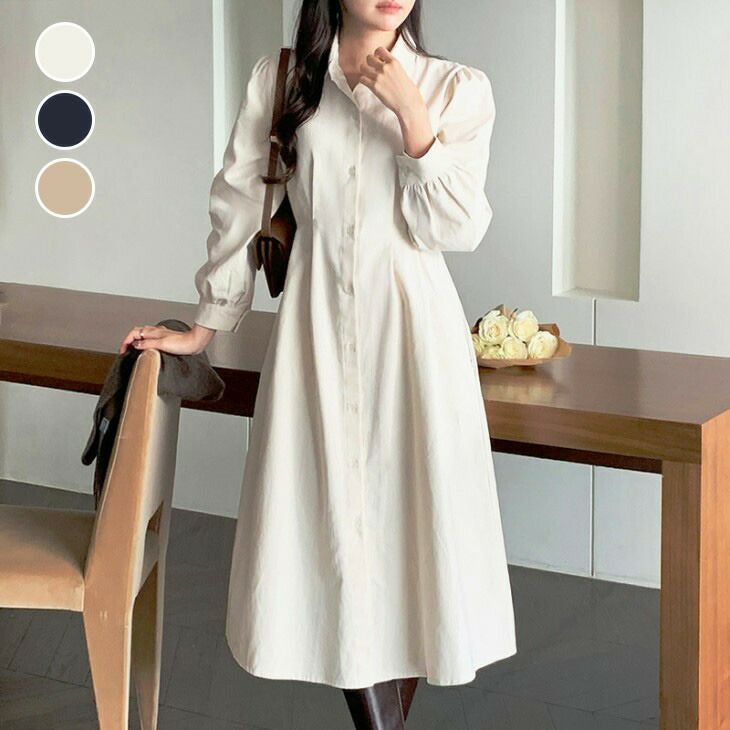 パフスリーブ シャツ ワンピース ワンピ 長袖 [AMELY by La-gemme]パフスリーブ シャツ ワンピース ワンピ 長袖 シンプル 無地 きれいめ ミモレ丈 オフィス フレア 春夏 おすすめ レディース オシャレ トレンド 人気 プチプラ 韓国ファッション【9523-ne】【予約販売:15-20日】【送料無料】メ込2