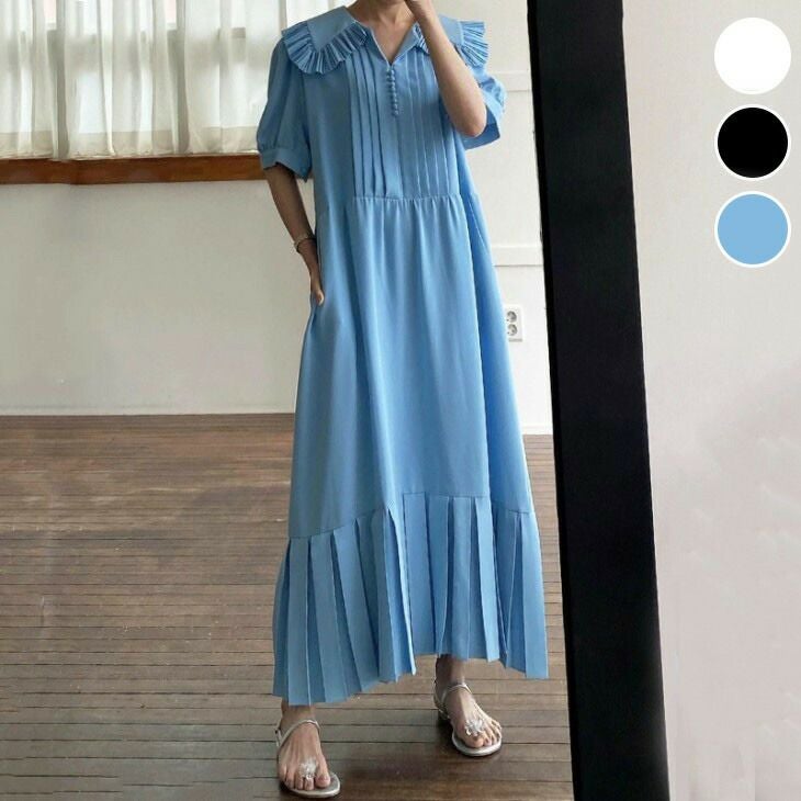 プリーツ フリルカラー ワンピース ロング ワンピ [AMELY by La-gemme]プリーツ フリルカラー ワンピース ロング ワンピ ティアード ガーリー ビッグカラー 半袖 シンプル 夏 おすすめ レディース オシャレ トレンド 人気 プチプラ 韓国ファッション 【9680-fx】【予約販売:15-20日】【送料無料】メ込2