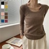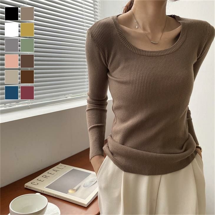 ラウンドネック リブ ニット トップス 太リブ [AMELY by La-gemme]【春夏販売】ラウンドネック リブ ニット トップス 太リブ Uネック 長袖 細身 伸縮 細見え デコルテ 重ね着 レイヤード インナー お洒落 多色展開 レディース 春夏 韓国ファッション【9915-lj】【即納:1-5営業日】【送料無料】メ込1