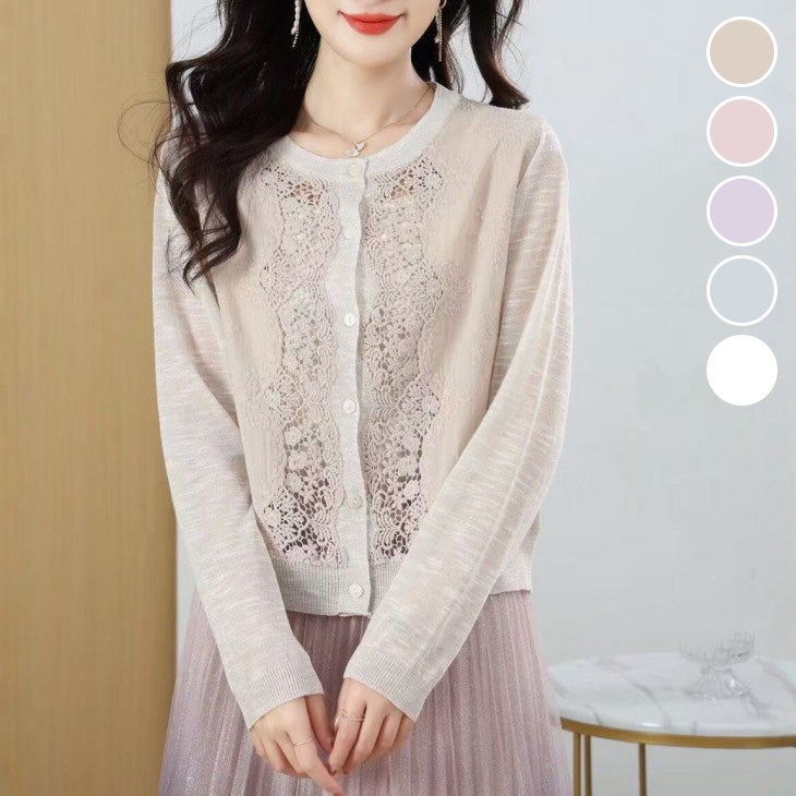 レース切り替え カーディガン ニット 透け感 シースルー [AMELY by La-gemme]レース切り替え カーディガン ニット 透け感 シースルー 羽織り 薄手 クルーネック 上品 長袖 春夏 おすすめ レディース オシャレ トレンド 人気 プチプラ 韓国ファッション 【a26-wp5153】【予約販売:15-20日】【送料無料】メ込2