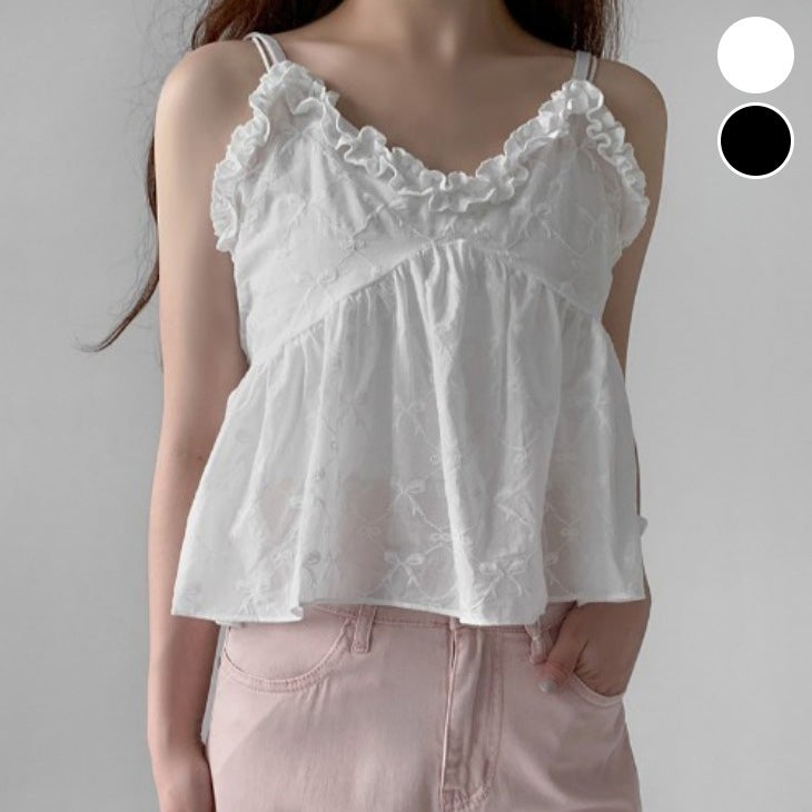 リボン刺繍 フリル キャミソール Vネック ペプラム [AMELY by La-gemme]リボン刺繍 フリル キャミソール Vネック ペプラム キャミ 肩紐調整可 シアー カジュアル ガーリー 春夏 おすすめ レディース オシャレ トレンド 人気 プチプラ 韓国ファッション 【a8804-n】【予約販売:15-20日】【送料無料】メ込2