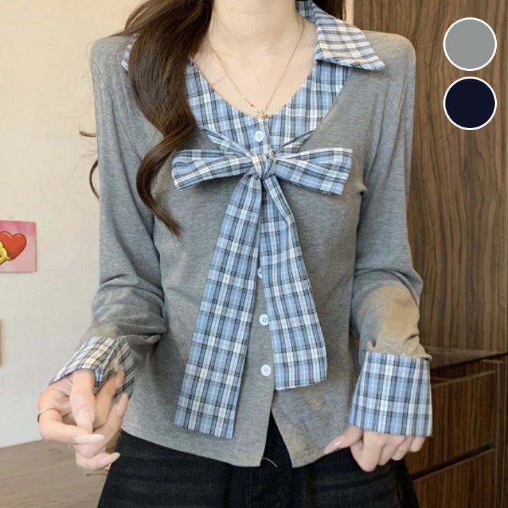 リボンデザイン カーディガン 長袖 チェック柄 配色 [AMELY by La-gemme]リボンデザイン カーディガン 長袖 チェック柄 配色 ドッキング トップス きれいめ ガーリー 春夏 おすすめ レディース オシャレ トレンド 人気 プチプラ 韓国ファッション 【a9936-gt】【予約販売:15-20日】【送料無料】メ込2