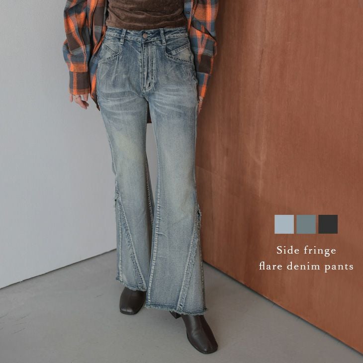 サイドフリンジ フレアデニムパンツ ウォッシュ加工 Y2K [AMELY by La-gemme]サイドフリンジ フレアデニムパンツ ウォッシュ加工 ヴィンテージライク Y2K 美脚 スタイルアップ ストレッチ ボトムス レディース おすすめ おしゃれ 2025秋冬新作 【abtaw25-1652】【即納:1-5営業日】【送料無料】メ込2