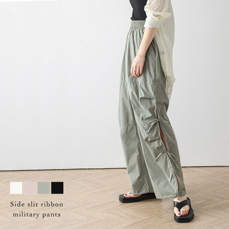 サイドスリット リボン ミリタリーパンツ ワイド [AMELY by La-gemme]サイドスリット リボン ミリタリーパンツ ワイドシルエット ドロスト 軽量 ボトムス レディース おすすめ おしゃれ フリーサイズ メール便 2025春夏新作【abtss24-270】【即納:1-5営業日】【送料無料】ユ込3
