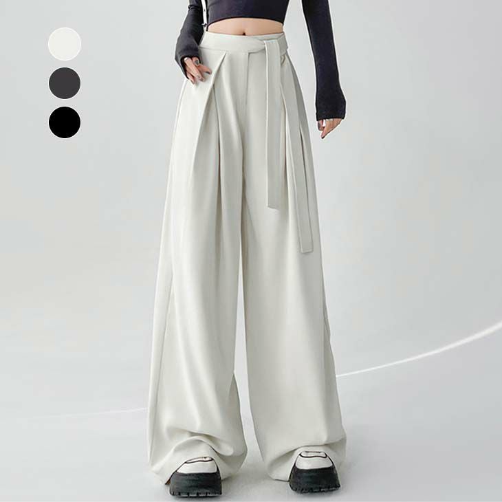ハイウエスト ラップ風 スラックス パンツ ワイド [AMELY by La-gemme]ハイウエスト ラップ風 スラックス パンツ ワイド ルーズレッグ タッグ 楽ちん お洒落 きれいめ 個性的 おすすめ レディース オシャレ トレンド 人気 プチプラ 韓国ファッション【3085-ff】【予約販売:15-20日】【送料無料】メ込3