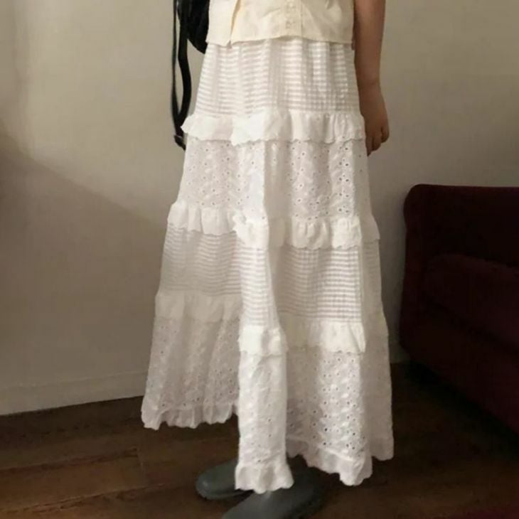 ティアード スカート レース風 フレア ロング丈 [AMELY by La-gemme]ティアード スカート レース風 フレア ロング丈 Aライン カジュアル マキシ丈 ボトムス かわいい おすすめ レディース オシャレ トレンド 人気 プチプラ 韓国ファッション【7008-gt】【予約販売:15-20日】【送料無料】メ込4