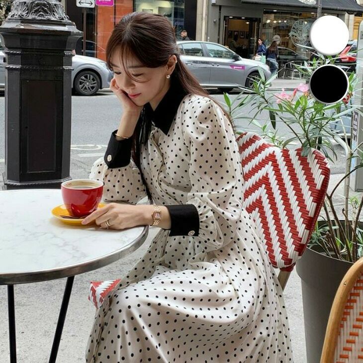 [AMELY by La-gemme]ドット ワンピース 異素材 シャツワンピ カジュアル ロング丈 きれいめ 水玉 おすすめ デート おでかけ レディース 長袖 女子会 オシャレ トレンド 人気 プチプラ 韓国ファッション 【10967-k】【予約販売:15-20日】【送料無料】メ込3