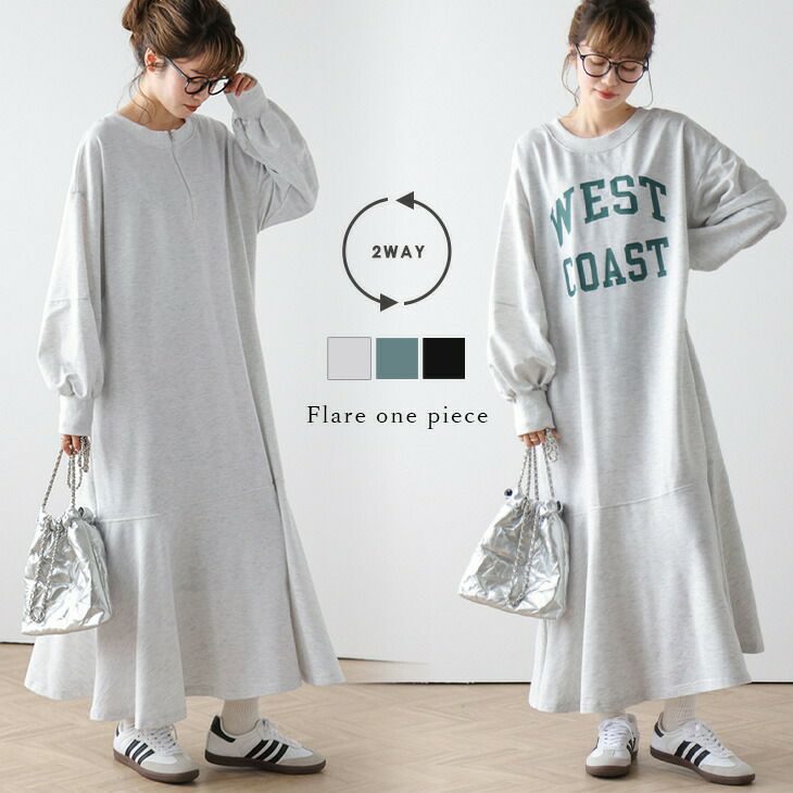 ロゴ ハーフジップ 前後2way 裾フレア スウェットワンピース [AMELY by La-gemme]ロゴ ハーフジップ 前後2way 裾フレア スウェットワンピース 体型カバー ロング ワンピース 長袖 レディース おすすめ おしゃれ フリーサイズ 2025春夏新作 【ass24-wp142】【即納:1-5営業日】【送料無料】60込