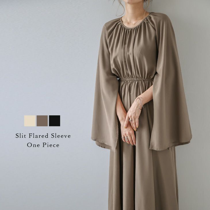 ワンピース フレアスリーブ スリット きれいめ ウエストゴム [AMELY by La-gemme]ワンピース フレアスリーブ スリット きれいめ ウエストゴム 長袖 レディース 高見え ギャザー スタイルアップ 映える おすすめ おしゃれ ブラック 2025春夏新作 【awp301-592】【即納:1-5営業日】【送料無料】メ込2