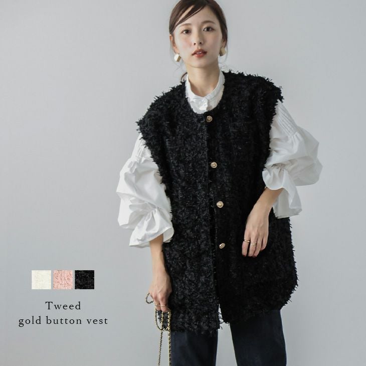 ツイードベスト ジレ ゴールド ポケット付き ミドル丈 【秋冬半額SALE対象】 [AMELY by La-gemme]ツイードベスト ジレ ゴールド ポケット付き ミドル丈 レディース おすすめ おしゃれ ブラック フリーサイズ 2025春夏新作 【aot302-850】【即納:1-5営業日】【送料無料】宅込