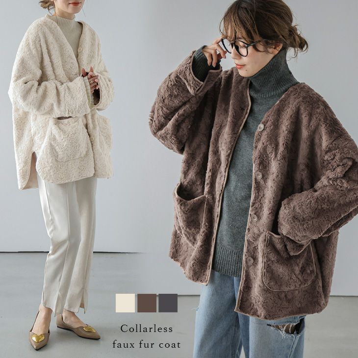 フェイクファーコート ノーカラー ランダムカットファー コート 【秋冬半額SALE対象】 [AMELY by La-gemme]フェイクファーコート ノーカラー ランダムカットファー コート ミドル丈 ポケット付き アウター レディース おすすめ おしゃれ フリーサイズ 2025春夏新作 【aot304-372】【即納:1-5営業日】【送料無料】宅込