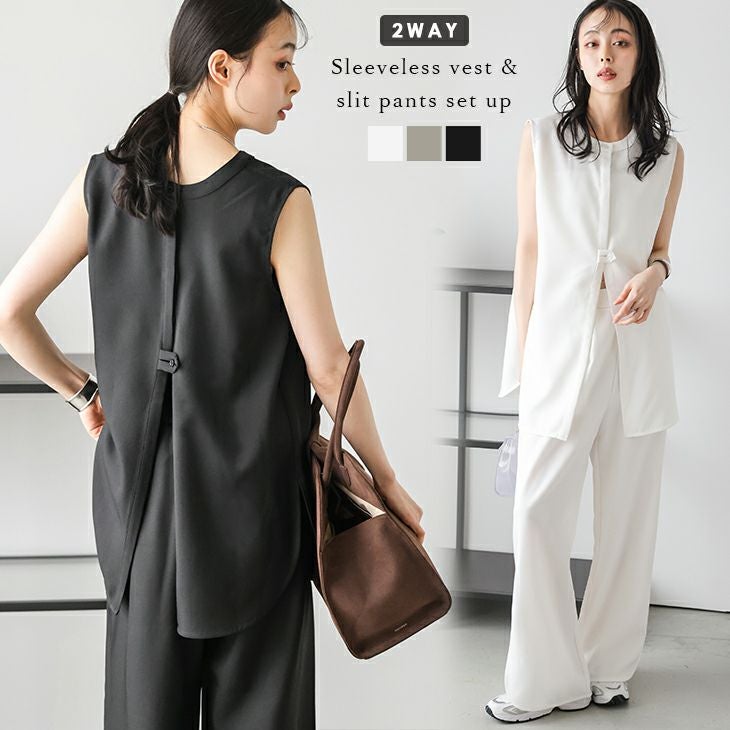セットアップ 前後2way ラウンドスリット ノースリーブ 【春夏半額SALE対象】 [AMELY by La-gemme]セットアップ 前後2way ラウンドスリット ノースリーブ スリットパンツ 比翼仕立て ノーカラー シンプル 2点セット レディース フリーサイズ 2025春夏新作【asess25-1087】【即納:1-5営業日】【送料無料】メ込2