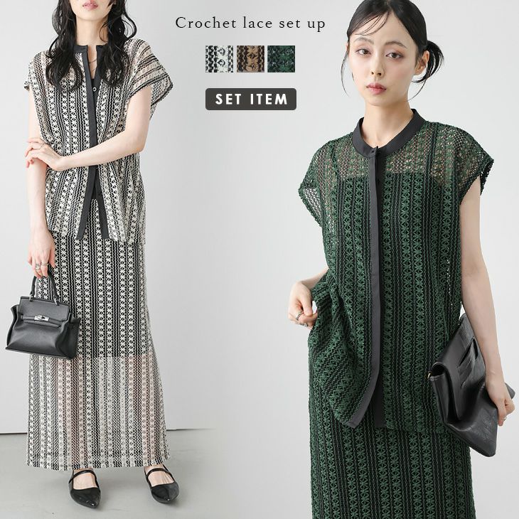 クロシェレース セットアップ バイカラー ストライプ 【春夏半額SALE対象】 [AMELY by La-gemme]クロシェレース セットアップ バイカラー ストライプ 比翼仕立て バンドカラー フレンチスリーブ バックスリット ウエストゴム レディース おすすめ おしゃれ 2025春夏新作 【asess25-1409】【即納:1-5営業日】【送料無料】メ込4