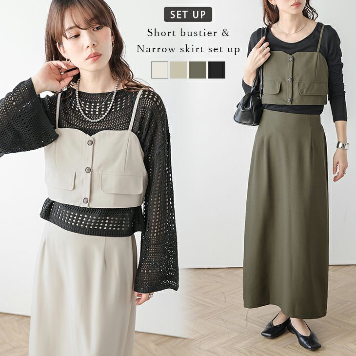 セットアップ ビスチェ ナロースカート ロング [AMELY by La-gemme]セットアップ ビスチェ ショート丈 ナロースカート ロング フラップポケット レイヤード 大人カジュアル 着回し レディース おすすめ おしゃれ フリーサイズ メール便 2026春夏新作【asess26-1979】【予約販売:4月2日入荷予定順次発送】【送料無料】メ込2