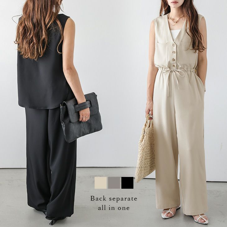 オールインワン セットアップ 2way Vネック ジレ 【春夏半額SALE対象】 [AMELY by La-gemme]オールインワン セットアップ 2way Vネック ジレ ワイドパンツ ドロスト ウエストゴム オフィスカジュアル レイヤード 着痩せ 着映え 時短コーデ レディース おすすめ おしゃれ 2025春夏新作 【asrss25-1443】【即納:1-5営業日】【送料無料】メ込2