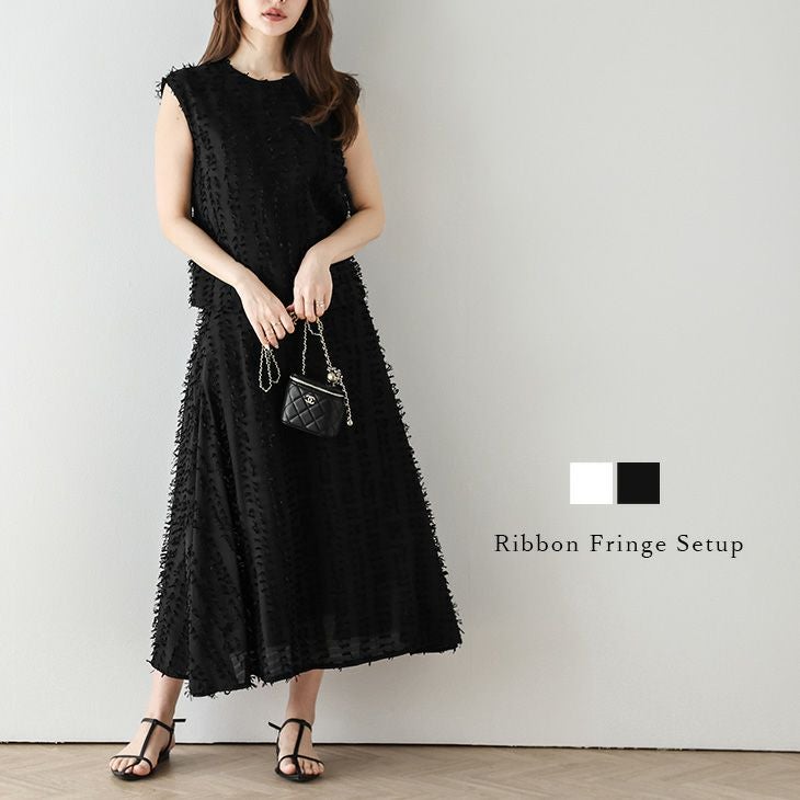 セットアップ リボンフリンジ ジャガード 透け感 【春夏半額SALE対象】 [AMELY by La-gemme]セットアップ リボンフリンジ ジャガード 透け感 オケージョン フレアスカート ノースリーブ 大人可愛い トレンド レディース 2025春夏新作【astss24-215】【即納:1-5営業日】【送料無料】宅込
