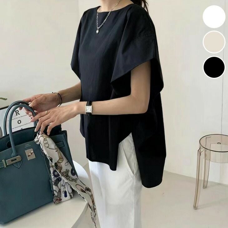 Tシャツ ショルダータック フレンチ袖 スリット 大人カジュアル [AMELY by La-gemme]Tシャツ ショルダータック フレンチ袖 スリット 大人カジュアル ラフ シンプル ロング 体型カバー おすすめ おしゃれ レディース トレンド 人気 プチプラ 韓国ファッション 2025春夏新作 【atp1305-gr】【予約販売:15-20日】【送料無料】メ込2