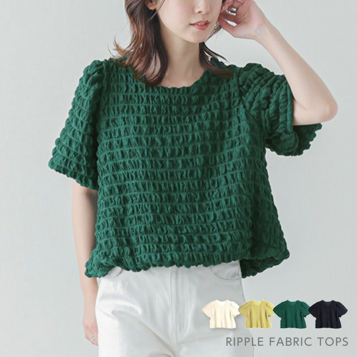 Tシャツ リップル生地 半袖 トップス ボリューム袖 [AMELY by La-gemme]Tシャツ リップル生地 半袖 トップス ボリューム袖 二の腕カバー レディース おすすめ おしゃれ ブラック フリーサイズ 2025春夏新作 【atp203-313】【即納:1-5営業日】【送料無料】60込