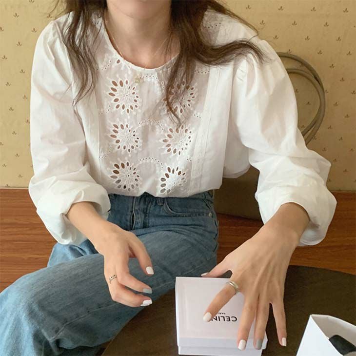 [AMELY by La-gemme]ブラウス カットワーク レース [AMELY by La-gemme]ブラウス カットワーク レース 刺繍 ラウンドネック トップス カジュアル きれいめ 可愛い おしゃれ ホワイト レディース 韓国ファッション 【atp302-020】【予約販売:15-20日】【送料無料】メ込2